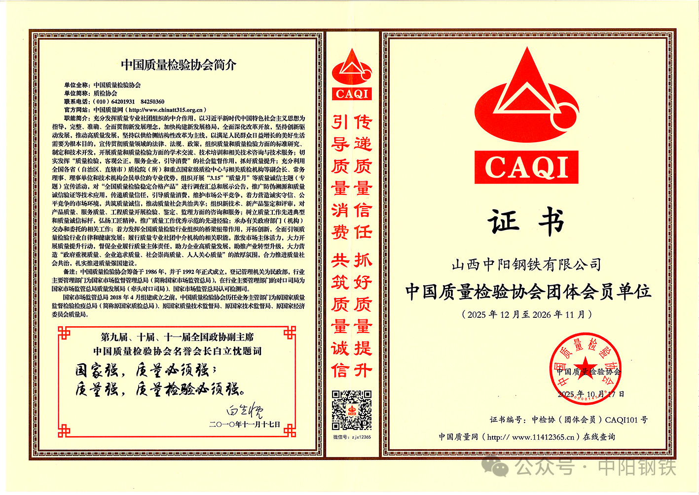 近日,中阳钢铁成功获评“中国质量检验协会团体会员单位”。这一荣誉标志着国家权威质量机构对公司长期以来坚持“质量为本”发展理念的高度认可。