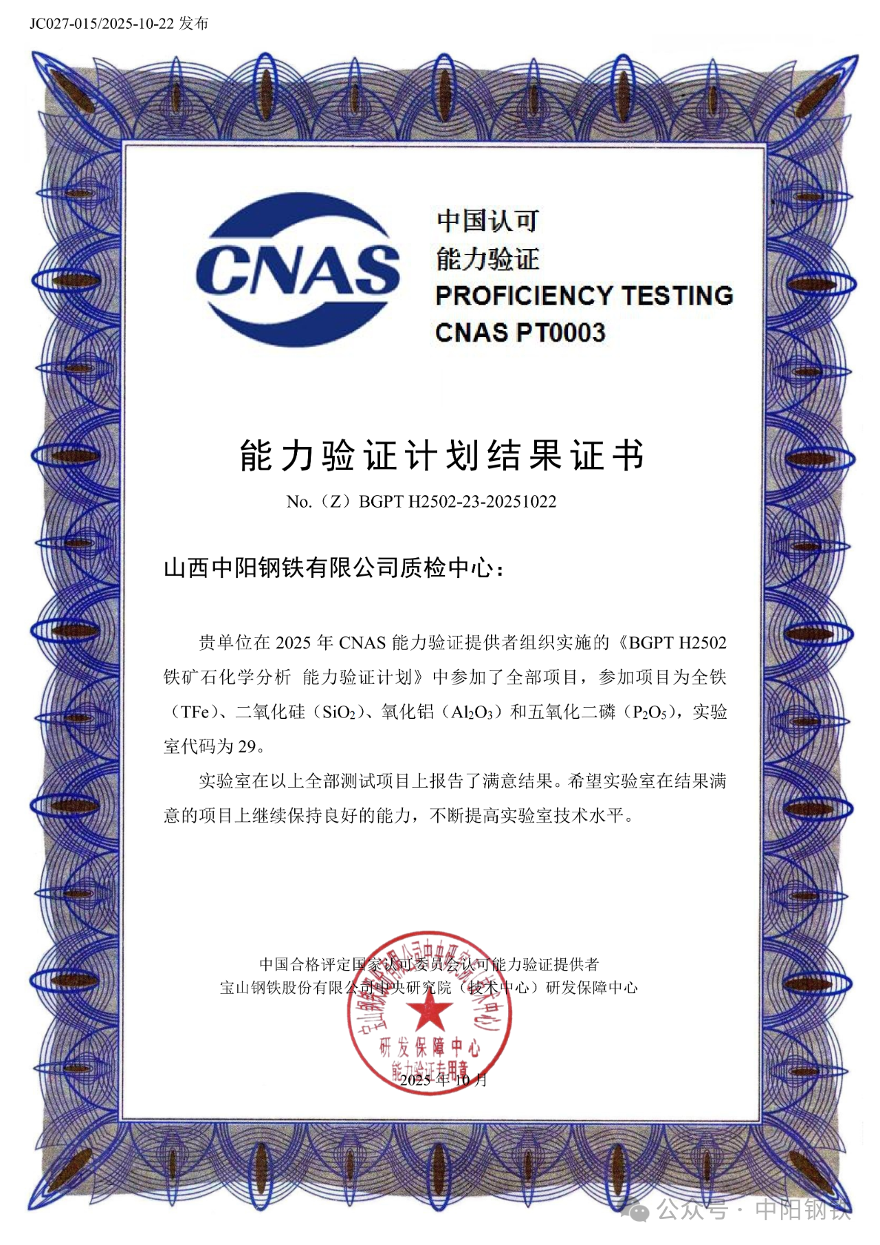此次顺利通过能力验证,不仅是对中阳钢铁质检中心在铁矿石检测方面技术能力的权威认可,也为公司原材料质量管控提供了有力支撑。未来,质检中心将继续保持过硬的技术水平,持续优化检测流程,提升实验室综合能力,为企业高质量发展筑牢坚实的质量检测防线。