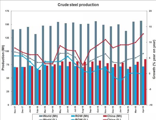 土耳其2019年4月粗钢产量为300万吨,同比提高2.6%。
